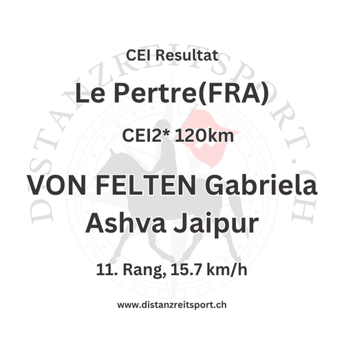 International CEI Le Pertre (FRA) Resultate CEI Le Pertre (FRA) mit Schweizer Beteiligung und einer tollen Klassierung! 04.10.2025, CEI2*, 120km, VON FELTEN Gabriela mit Ashva Jaipur, 11. Rang, 15.7 km/h tagPlaceholderTags: